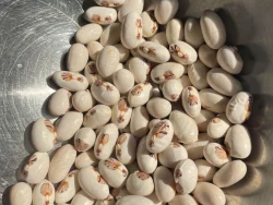 Traditional Turkish pole bean. Flavorful wide pods can be harvested like a snap bean. White seeds have brown patterns around the hull that resemble whirling dervishes, hence the name Mevlana. Another favorite bean of ours!
