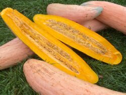 Banana-shaped, long fruits have delicious, sweet flavor which is great for pies and roasting. Fruits usually weigh 10-15 lbs. Pick when they are 18-20″.